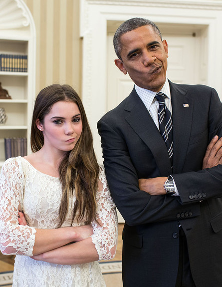 אובמה שוב מוכיח שהוא הכי קול בעולם, כשהוא מצטלם עם המדליסטית האולימפית מקיילה מרוני ושניהם משחזרים את ההבעה המפורסמת שלה שהפכה למם.