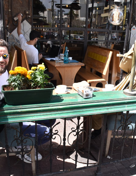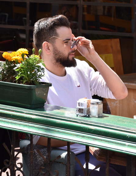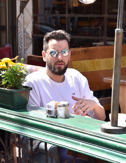 הוא יושב, מחייך, רגוע ובפאן שלו