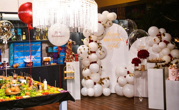 עמדת בלונים וורדים אדומים, וכן קיר מתנות לאורחים ולחברים הקרובים שהגיעו לשמוח