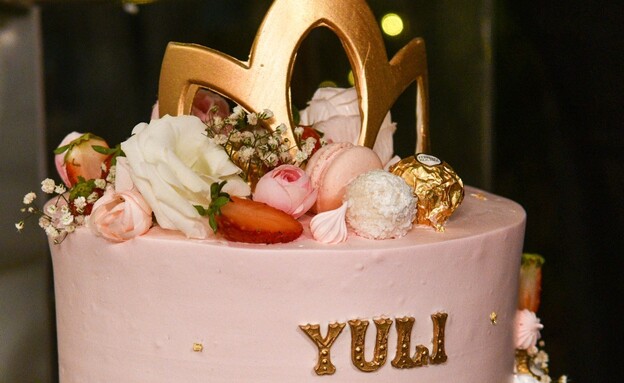 עוגה ורודה ומעוצבת עם שמה של יולי, כשבפסגה עומד לו כתר זהב