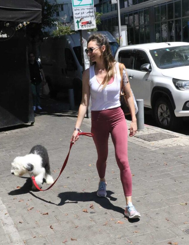 מיכל אנסקי, בכבודה ובעצמה, בעיצומו של טיול רגלי עם הכלב החדש שלה, גור בן חצי שנה העונה לשם "לב"
