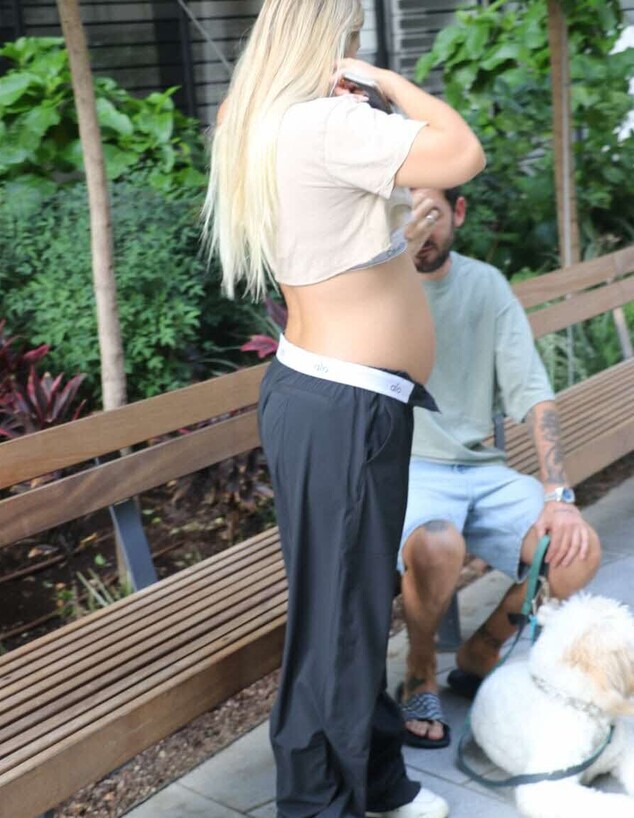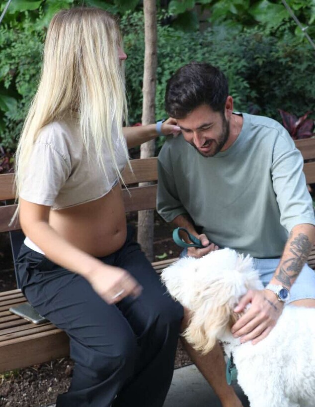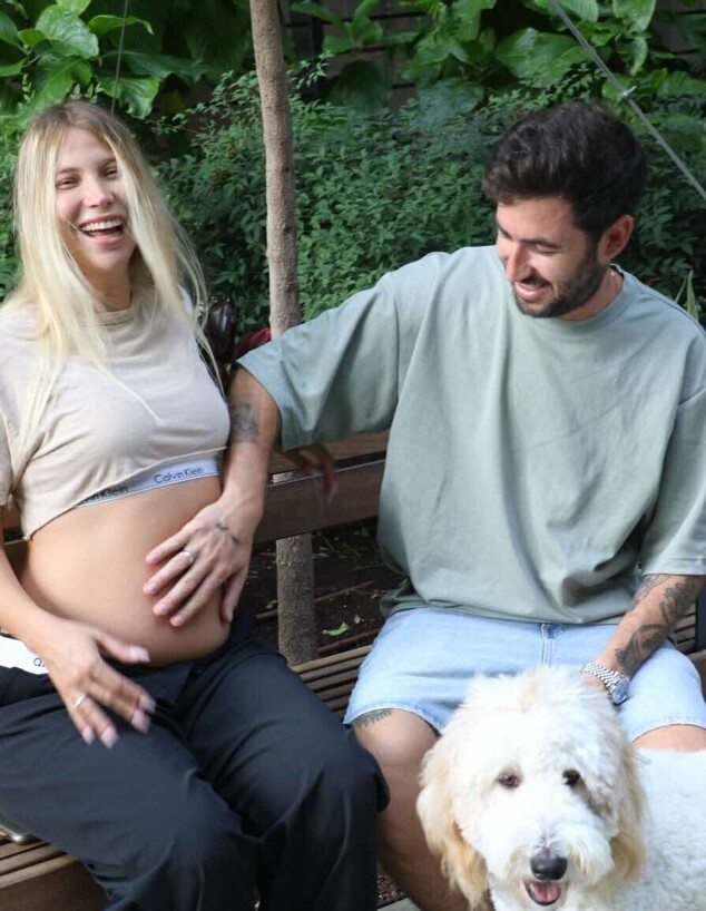 הכלב המתוק של הזוג מרחרח את הבטן. נו, גילית כבר אם יהיה לך אח או אחות?