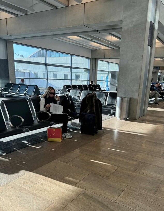 תראו מי זאת פה שתפסנו יושבת בנתב"ג וממתינה לטיסה שלה כשהיא לגמרי לבדה ללא החבר - זוהי עומר נודלמן כמובן, שיושבת כאחת האדם ומתענגת על כריך טוב