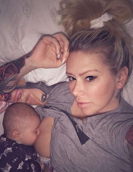 מעריכים את הכישורים המוטוריים של אוליביה ויילד, שמאזנת תינוקת יונקת וטלפון לעשות איתו סלפי