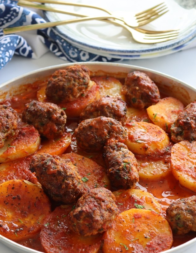 קפטה טורקית. כלים לשטוף: סכין, קרש חיתוך, 2 קערות, תבנית