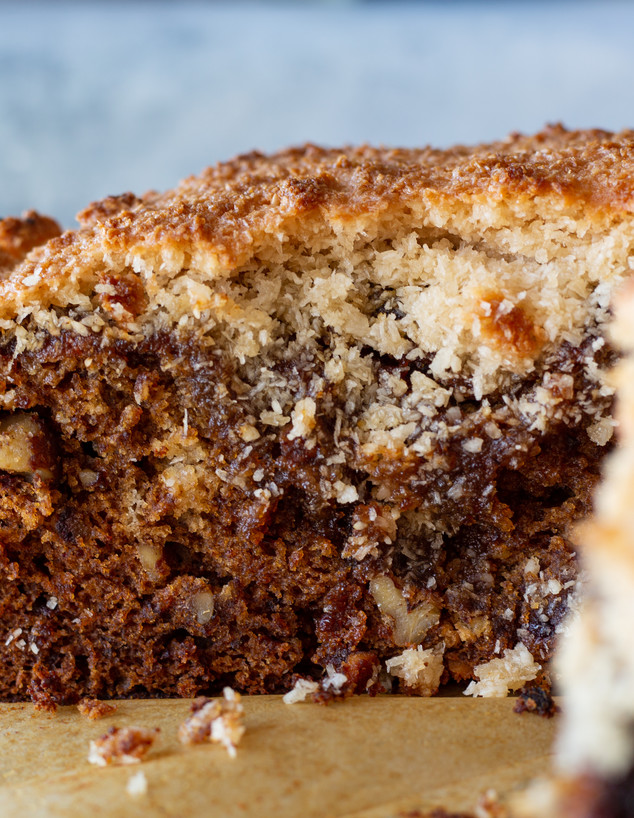 גרסת הפרווה של קרן אגם לעוגת תמרים עם ציפוי קוקוס קרמלי. למתכון: עוגת תמרים בציפוי קוקוס