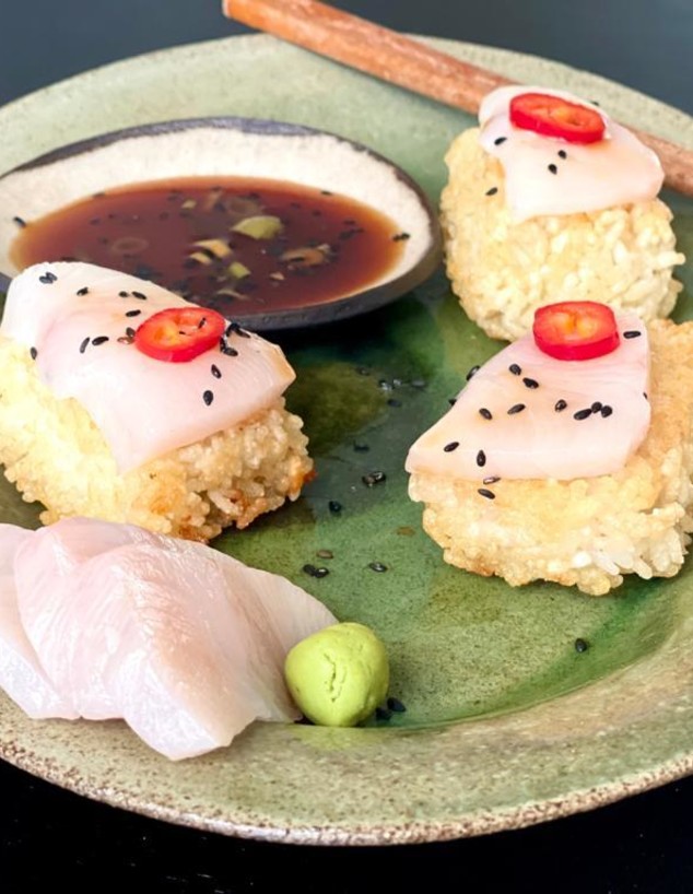 ארוחת ערב בבית שמרגישה ונראית כמו ארוחה במסעדה. למתכון: קוביות אורז צלויות עם סשימי