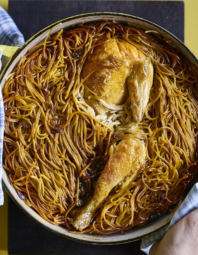 חמין מקרוני ועוף, חמוצים, סלט ירוקים ופיצוחים ועוגיות. 4 מתכונים לארוחה לשבת