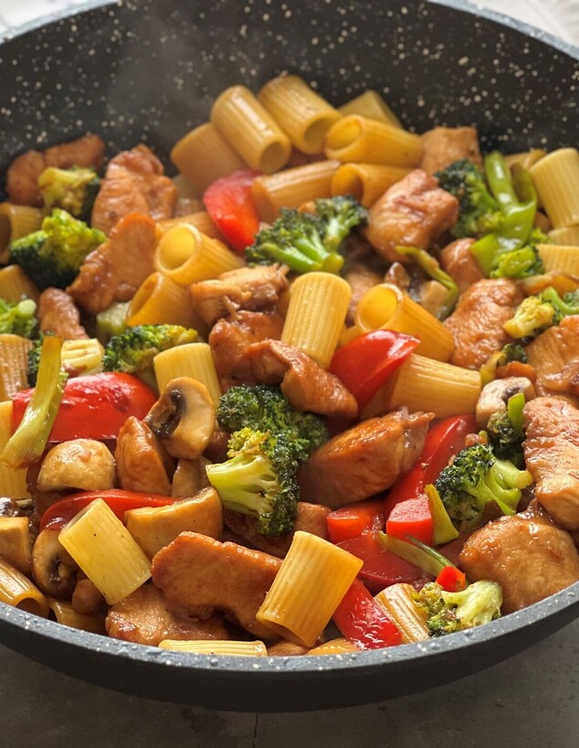עוד לא החלטנו אם זה יותר קל או יותר זריז. למתכון: מוקפץ זריז של פסטה, ירקות וחזה עוף