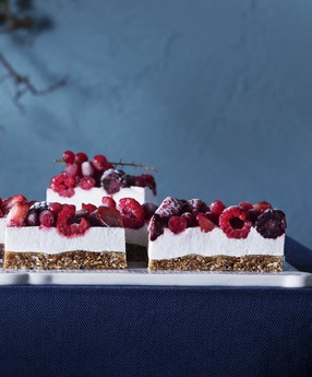 קינוח עסיסי ויפהפה ללא גלוטן, שאפשר לנשנש ללא ייסורי מצפון. כאן קישטנו אותו בפירות יער, אבל גם כל פרי עונתי אחר יתאים. למתכון