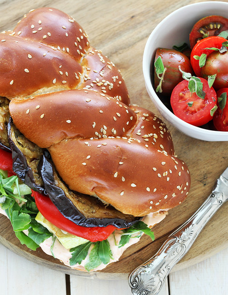 כריך כיפי, צבעוני והכי פשוט שיש, עם המון ירקות קלויים, שמן זית טוב וגבינת קרם שמנת. לחמנייה טרייה - וזהו, יותר מזה לא צריך. למתכון