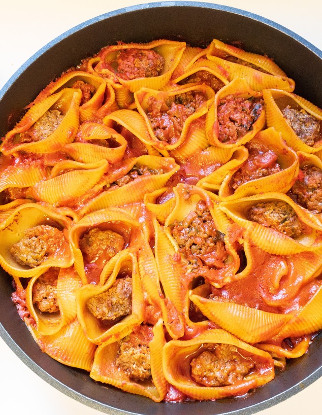 מתחילים במחבת, ממשיכים בתנור, והכל ביחד לוקח פחות משעה. למתכון: קונכיות פסטה ממולאות בשר