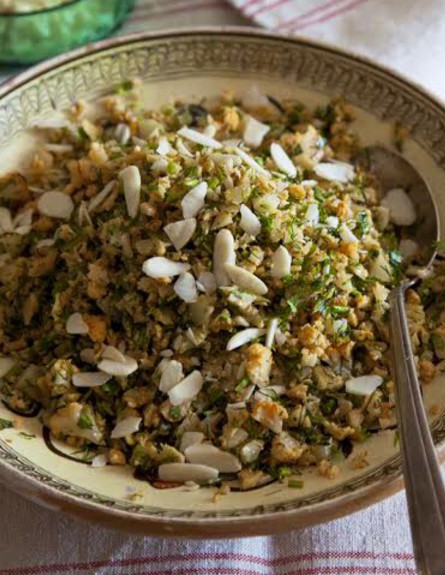 סלט מושקע ומתגמל בכל ביס: טבולה כרובית עם עשבי תיבול ושקדים. אפשר גם להגיש ללא היוגורט