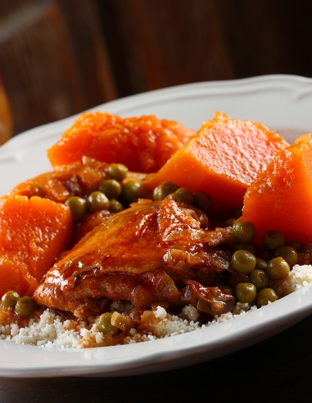 תבשיל של עוף, אפונה ודלעת שמוגש על קוסקוס ומבהיר יותר מכל דבר אחר: הגעתם הביתה. למתכון: טבחה בלקרעה