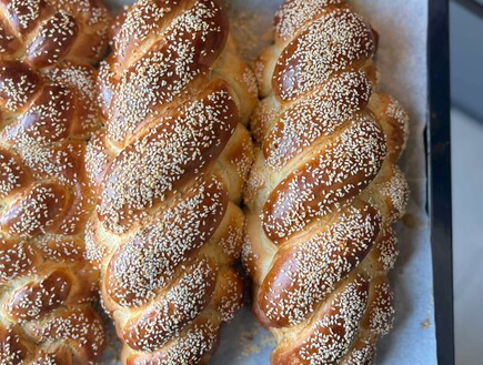 7 מברישים את החלות בביצה טרופה ומקשטים בשומשום. אופים 25-30 דקות, עד שהתחתית של החלות זהובה.