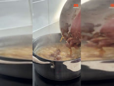 4 בינתיים, מחממים היטב את 3 כפות השמן הנותרות במחבת. מוסיפים את הבצל ומטגנים עד שהוא מתחיל להזהיב, אך לא משחים. מוסיפים את הבצל למרק המוכן, ביחד עם השמן שנותר במחבת.