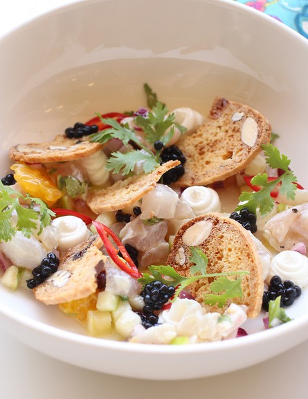 סביצ'ה דג עם תפוזים, תפוחים, ביסקוטי, בצל סגול, מרמלדה ויוגורט | מסעדת אדום, ירושלים