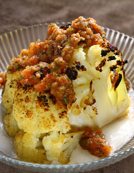 כרובית שלמה צלויה בתנור אבן, על טחינת יוגורט עם סלסת עגבניות פיקנטית | קפה דיזנגוף, תל אביב