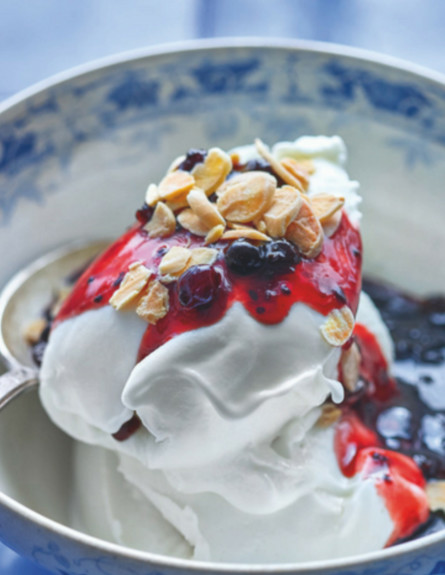 קיימאקי - גלידת יוגורט עזים טרייה עם סירופ פטל ושקדים קלויים | גרקו, תל אביב