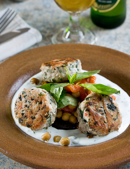 קבב דג ים עם חציל צרוב, גרגירי חומוס וציזיקי | קלמטה, תל אביב