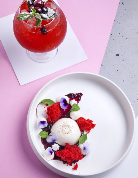 פנקוטה יוגורט עם ריבת פירות יער, גנאש שוקולד לבן מוקצף, מרנג ועוגת ספונג' תות | קוואטרו, תל אביב