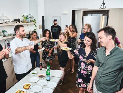 "מאד מתרגש לארח בפעם הראשונה ובפורמט הזה אורחים בבית שלי", סיפר השף בפתיחת הארוחה המפנקת שהכין עבורם.