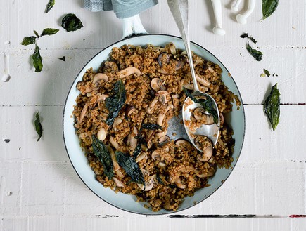 נמלאתי גאווה כשיותם אוטולנגי, השף הישראלי שכבש את לונדון, פרסם את הסלט הזה שלי במדור האוכל שלו בעיתון ה"גארדיאן" הבריטי. אני מאמינה שהטיפול הייחודי בבורגול והמפגש בין חומרי גלם המגיעים מעולמות קולינריים שונים - בורגול, פטריות יפניות, חומץ בלסמי - הם שקסמו לו. ובכלל, בלסמי מצומצם הוא חומר גלם נהדר, אפשר להכין אותו בבית על ידי בישול חומץ בלסמי וצמצומו לשליש מנפחו. הוא נשמר במקרר במשך שנים, ובגלל מרקמו הסמיך וטעמו העז מספיקות כמה טיפות ממנו כדי לשדרג שלל מאכלים. אל תוותרו על פטריות השימג'י - יש להן מראה אלגנטי, טעם עדין ומרקם שכמעט נמס בפה. אין צורך לנקות - פשוט גוזרים במספריים את הרגליים כ-2 ס"מ מעל למצע שמחבר אותן.