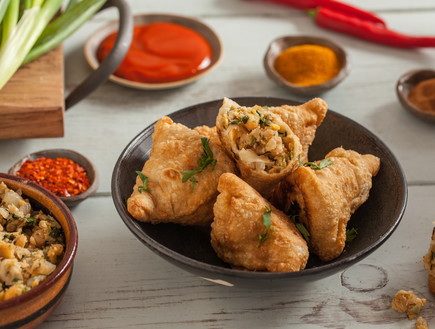 נגיסי בצק הודיים פריכים שמתפרקים בפה, במילוי חם של תפוחי אדמה, אפונה, צ'ילי ותבלינים