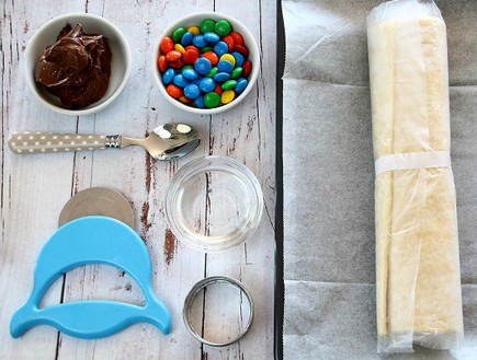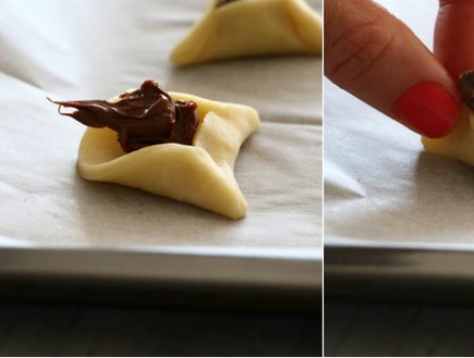 מה שנשאר מגליל הבצק, החזירו למקרר (מיד תבינו), כעת טבלו אצבע בקערית המים ועברו על שולי העיגולים (לא באמצע!) והניחו שוקולד במרכז כל עיגול