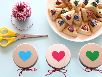 וכעת למשלוח מנות: צנצנת פלסטיק עם מכסה בהברגה, מדבקות לב צבעוניות, סרט צבעוני, מספריים