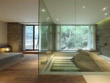 "בקתת השיבה" נמצאת בדרום מזרח סין. חדר הרחצה נבנה סביב סלע ענק שנשאר במקומו הטבעי