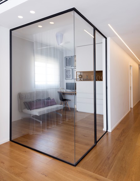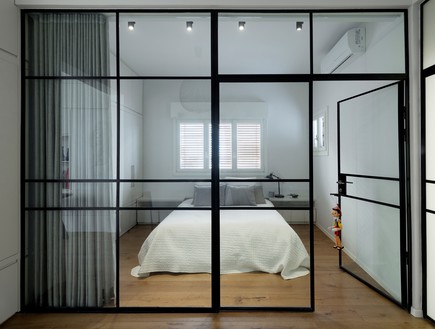קירות חדר שינה שקופים הפתוחים אל החלל הציבורי בדירה בתל אביב