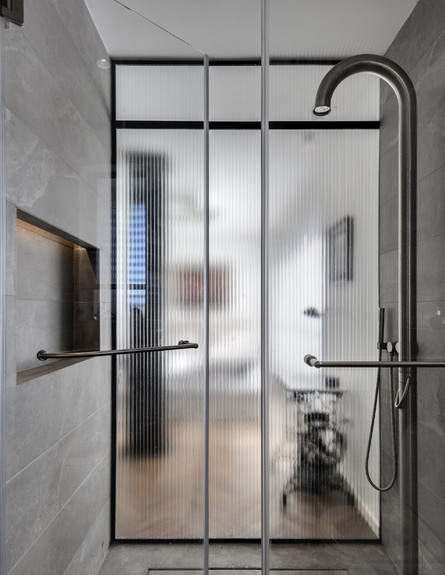 חדר רחצה עם שקיפות מטושטשת לחדר השינה - שימוש בזכוכית במטרה לייצר עניין וחלל המשכי