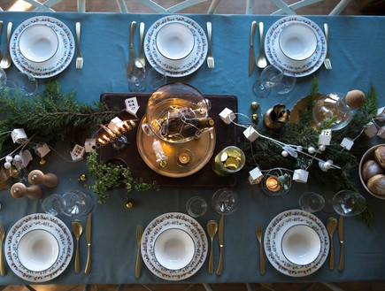 את השולחן השני עיצבנו בכחול, לבן וזהב חורפיים. הוספנו הרבה אור וכלי הגשה מבית קורנינג