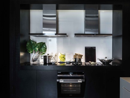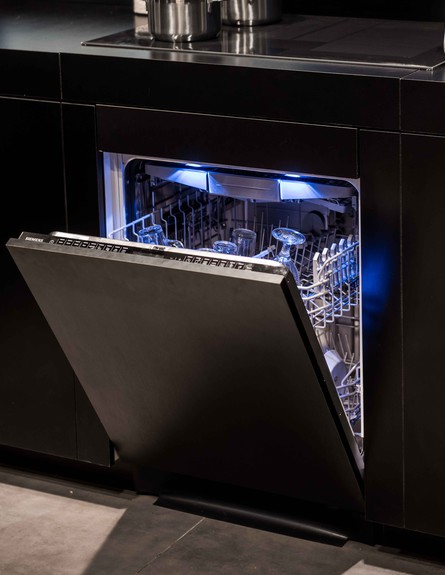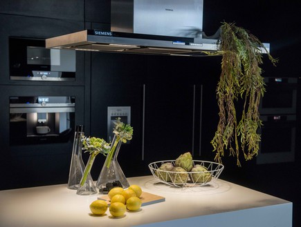 תאורה במטבח היא דבר הכרחי עבור תנאי עבודה מתאימים, לכן בחרנו את קולט האדים של סימנס. קולט האדים הוא בעל תאורת LED המאפשרת תאורה אופטימלית במהלך שימוש במשטח העבודה. אפשר ורצוי לנצל כל אזור במטבח, אנחנו בחרנו להשתמש בו גם כמדף, ממנו נשפך צמח הצובע את החלל בירוק.