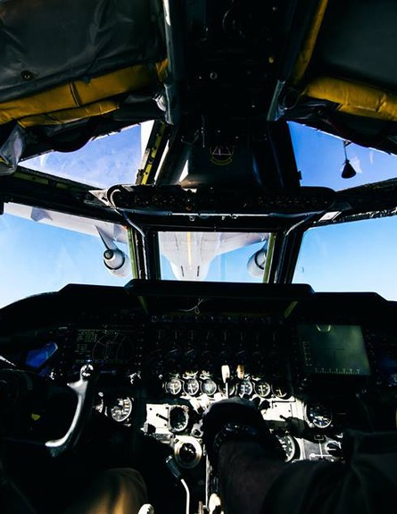 כך זה נראה מהצד של טייסי ה-B-52, שמתדלקים כאן ממטוס KC-10. ארה"ב מפעילה באזור 15-30 מטוסי תדלוק, אבל המאמץ הוא בינלאומי: גם טייסים בריטים, אוסטרלים, צרפתים וגרמנים הולמים בדאע"ש