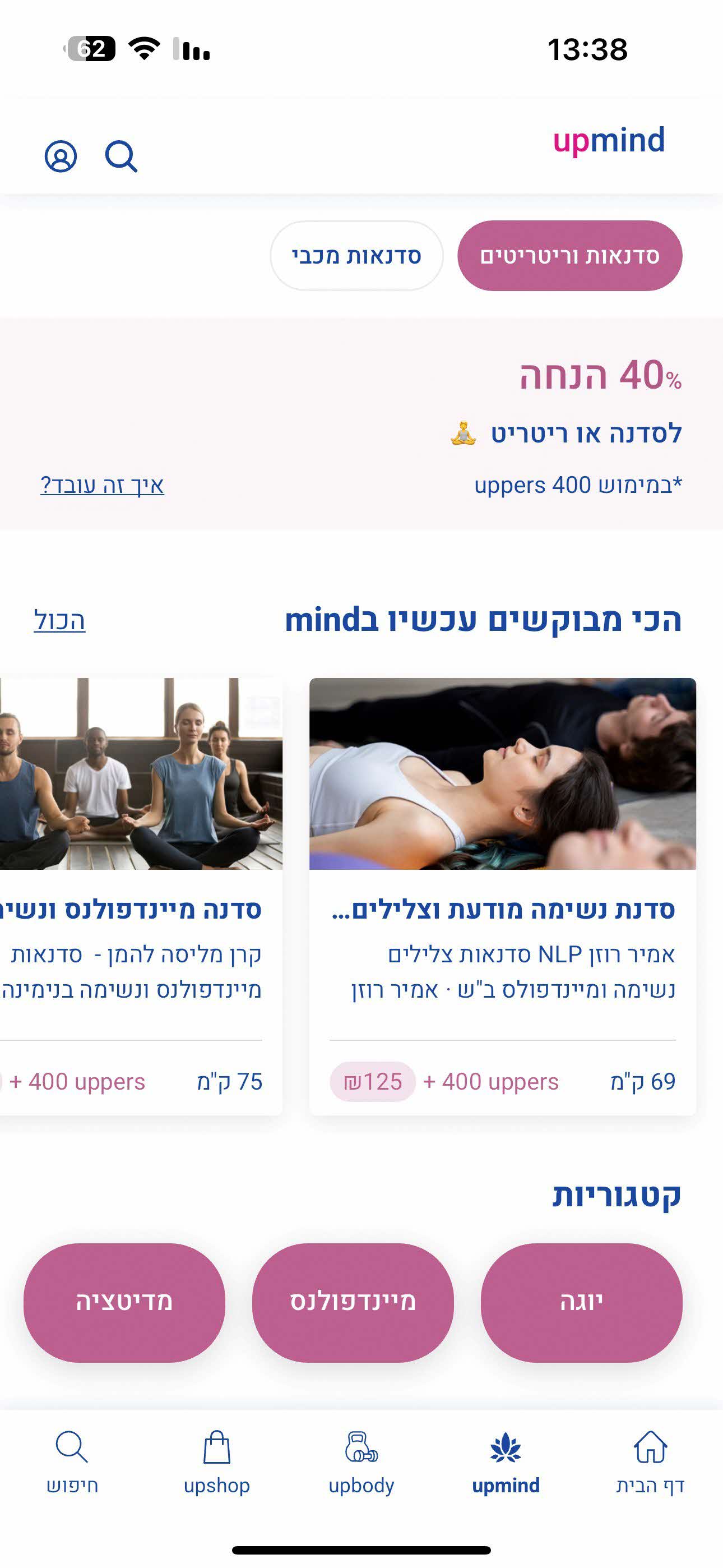 בימים אלו משיקה מכבי קטגוריה חדשה באפליקצית UPAPP, שתציע לחבריה מאות סדנאות ומפגשים חווייתיים בתחום הרווחה הנפשית כמו מיינדפולנס, תנועה, כתיבה יוצרת, נשימה, תיפוף, ציור, וסדנאות צחוק – כולם זמינים להזמנה בלחיצת כפתור, וכולם ב-40% הנחה לחברי הביטוח המשלים של מכבי.