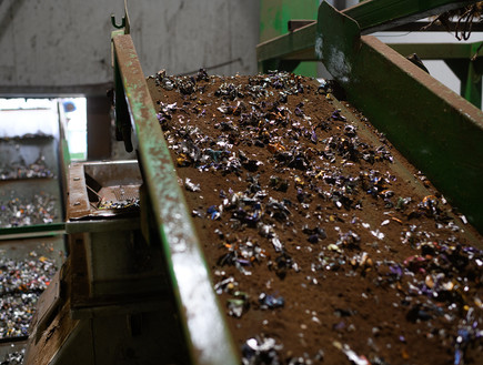 הקפסולות נאגרות אל תוך מתקן המחזור, עוד רגע הן ייגרסו והאלומיניום יופרד מהקפה.