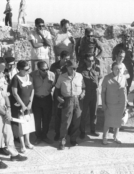 החפירות הארכאולוגיות בבית הכנסת העתיק בסוסיא חשפו רצפה גדולה מעוטרת בפסיפסים וגם חלקים של במת התפילה משיש. הארכאולוג שמריה גוטמן מסביר לראש הממשלה גולדה מאיר על הממצאים.
