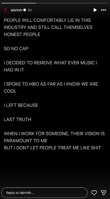 בשבת הוא פרסם סטורי נוסף, שמבהיר קצת יותר למה התכוון: "אנשים בתעשייה הזאת משקרים בנוחות ועדיין קוראים לעצמם אנשים ישרים", כתב. "אז בלי חרטות, החלטתי להסיר כל מוזיקה שהייתה לי בה. דיברתי עם HBO, ולמיטב ידיעתי אנחנו בסדר. עזבתי כי, האמת היא, כשאני עובד עבור מישהו, החזון שלו הוא הדבר החשוב ביותר עבורי. אבל אני לא נותן לאנשים להתייחס אליי כמו לחרא".